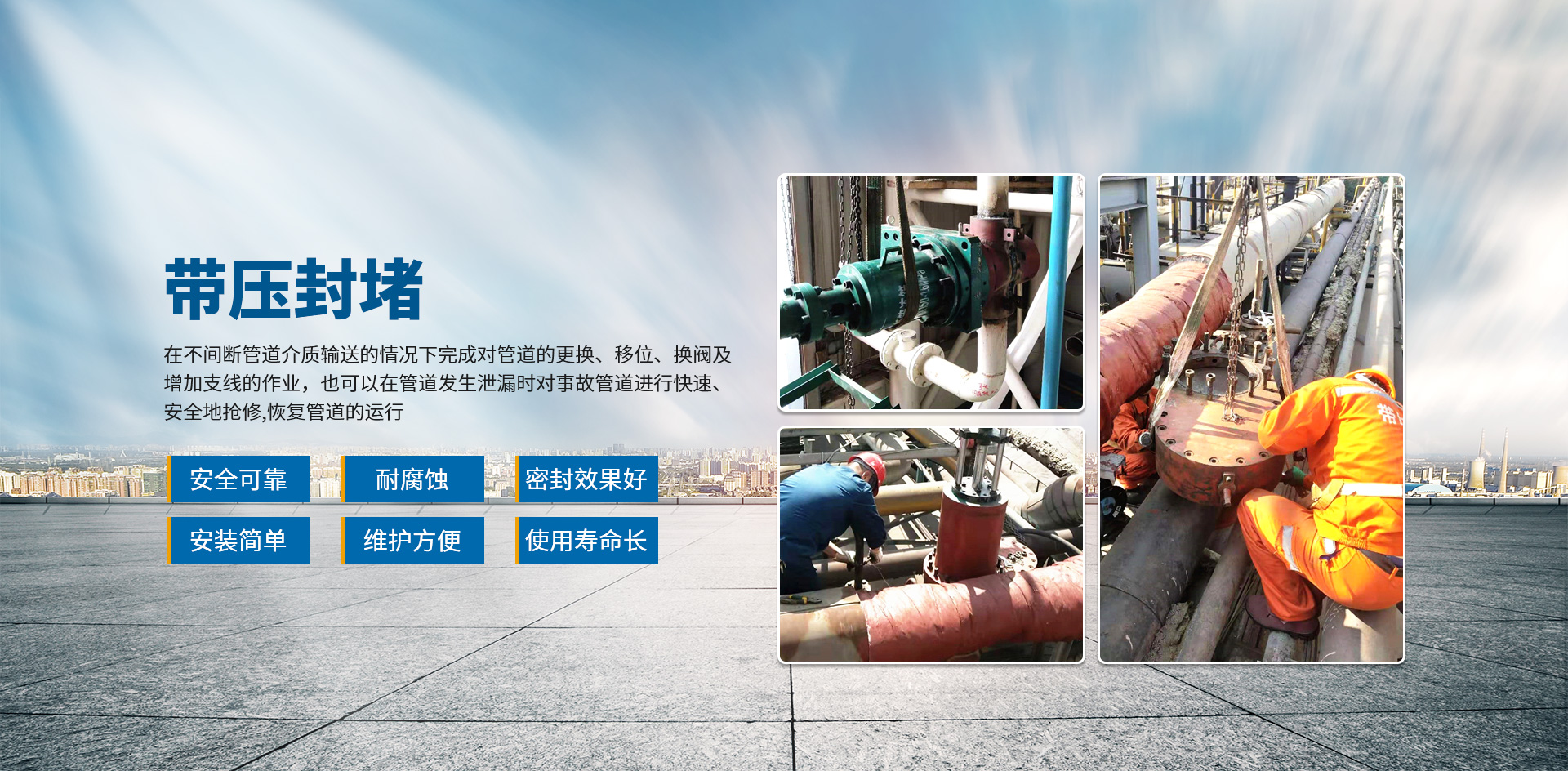 江蘇億晉昊堵漏工程有限公司專業(yè)從事堵漏工程,管道設(shè)備維修,管道帶壓開孔,管道帶壓封堵,管道帶壓堵漏,管道設(shè)備清洗等業(yè)務(wù)。經(jīng)過多年的發(fā)展,形成了集堵漏材料的研制、開發(fā)、生產(chǎn)、銷售與服務(wù)為一體的專業(yè)堵漏公司。